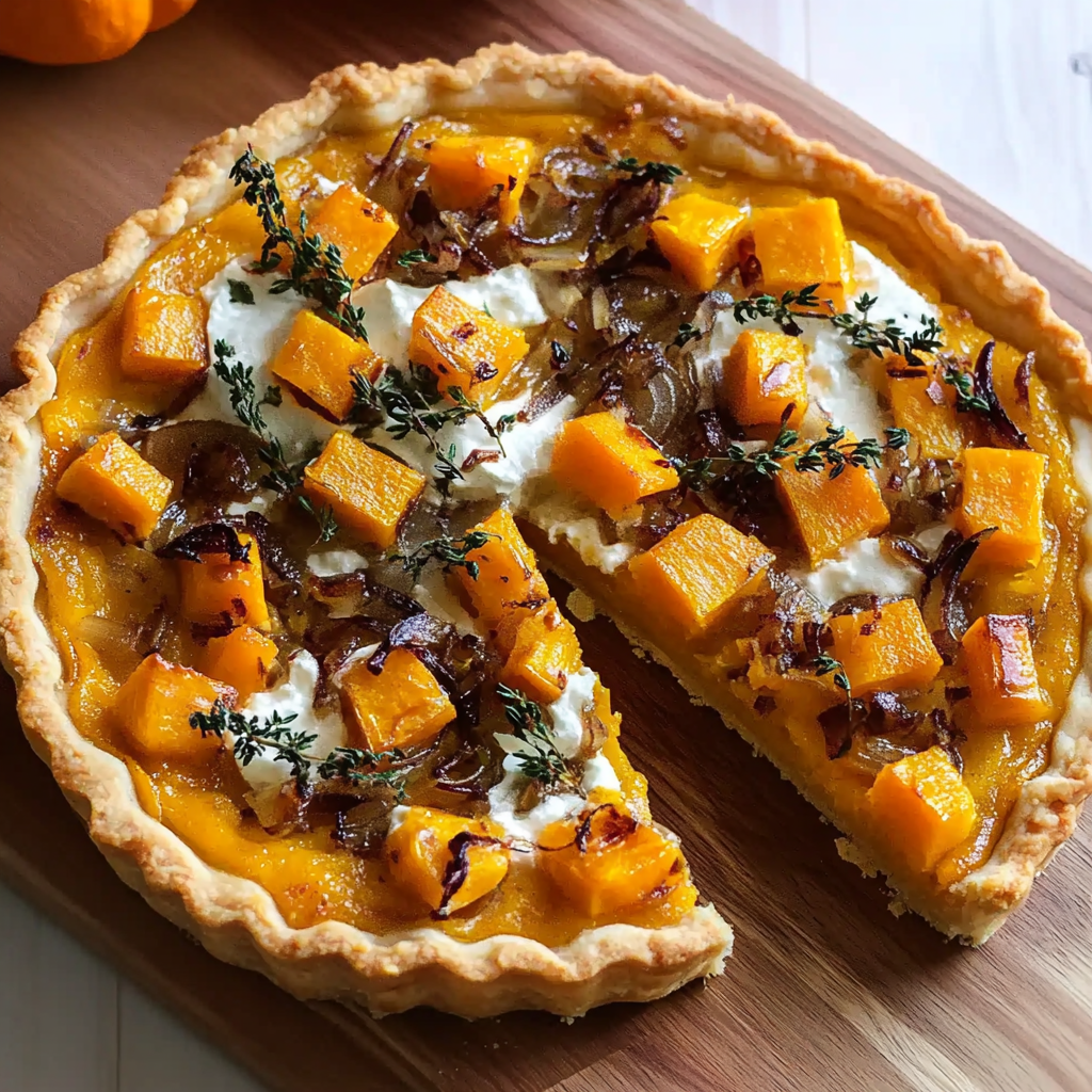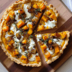 This tart is a savory dish featuring caramelized onions, roasted butternut squash, creamy cheese, and a flaky pastry crust. It’s great as a main course or side dish.