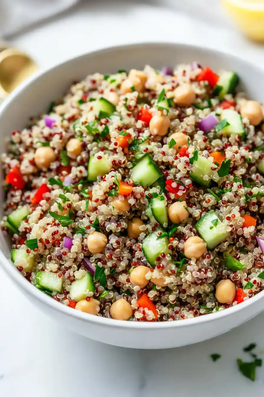 - In a large bowl, combine cooked quinoa, chickpeas, diced vegetables, and dressing. Toss gently to coat.